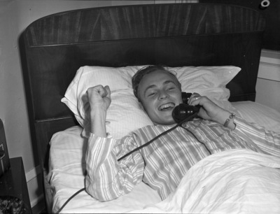 Robert Rucker, shown in bed after an operation, on the telephone. Rucker was the Polytechnic High School yell leader the previous year. Because he could not attend a pep rally before their game with Paschal High School, the school called him at his home and used the speaker system to tune in to the auditorium so that Rucker could hear the cheering. He is wearing striped pajamas.