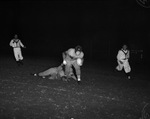 A Friday night high school football game between the Polytechnic Parrots and the Paschal Panthers is being held at Farrington Field in Fort Worth, Texas. Early in the first quarter, Poly back Kenneth Peacock is shown jerking loose from a pile-up of defenders. Peacock gained five on the play, bringing the ball to the Paschal thirty-five yard-line. Two referees are standing in the background, watching the action. Three players and two referees are in view on the field. Behind is a dimly lit score board. The players are in football uniforms and leather helmets, the referees are in light loose-fitting pants, long-sleeved shirts with a "Y" in black up the buttons and extending to each shoulder. "(Star-Telegram photo by Tom Dillard). Published Star-Telegram Morn. Oct. 25, 1941.