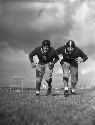 These fellows work at the Wog tackles in the annual game with the Baylor Cubs in Farrington Field. Left to right are Punk Smith (3) and John Polzin (56). Smith is a former football star with Polytechnic High School and North Texas Agricultural College. The 225-pounder will start at right tackle. Polzin is a product of Taylor, Texas. He hits the scales at 240 and will start at left tackle. Published in Fort Worth Star-Telegram, evening edition, October 28, 1941.