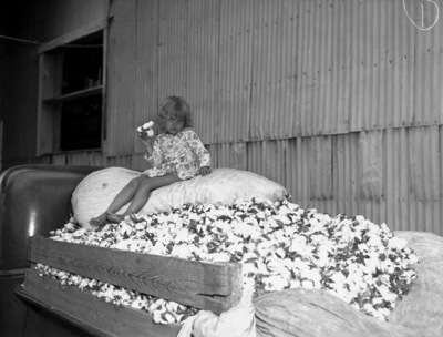 Early season heavy rains have delayed the cotton harvest a full month in Tarrant County, Texas. Local farmers are doing their best to get the last of the crop to the gin before the winter weather ruins their product. Riding on top of a load of cotton is Patsy Lee McPherson. She is the four-year-old daughter of Mr. and Mrs. T. W. McPherson, of Grapevine, Texas. Patsy Lee is wearing a plaid button-up dress.
