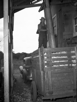 Early season heavy rains have delayed the cotton harvest a full month in Tarrant County, Texas. Local farmers are doing their best to get the last of the crop to the gin before the winter weather ruins their product. Steve Hodges, of Grapevine, Texas, is shown standing in the back of a trailer. He is using a suction pipe to unload cotton into the gin in under fifteen minutes. Mr. Hodges is dressed in a hat, button-up shirt with cuffed sleeves, and overalls.