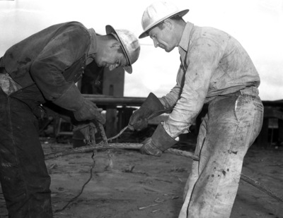 One of the busiest oil spots in the state is the Slaughter Pool. The drilling action is centered around Sundown, Texas, a small town in southwestern Hockley County. Splicing a line at the Sid W. Richardson Number 4 Sun-Miller, left to right, are Ray Lewis and Buck Greenlee. Mr. Lewis is wearing a hard hat, long-sleeve shirt, overalls, and gloves. Mr. Greenlee is dressed in a hard hat, button-up shirt, trousers, and gloves.