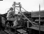One of the busiest oil spots in the state is the Slaughter Pool. The drilling action is centered around Sundown, Texas, a small town in southwestern Hockley County. Jack Hendrick is employed by the Pierce Contraction Company. He is shown operating a ditch digger for the new line. Mr. Hendrick is dressed in a cowboy hat, long-sleeve shirt, trousers, gloves, and boots.