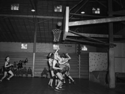 Basketball. Denton-Burleson. Ken Kearns making a bat-in goal. Denton High School's cagers gave a neat exhibition in the district tournament at Texas Christian University Friday, beating Burleson, 39-20.