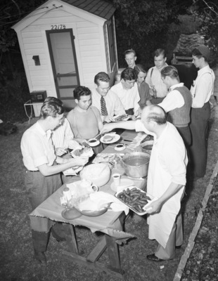 Texas Christian University Frog Band. Party. Left side, left to right, Karl Shirley, Hereford, Texas; Nat Wilson, Fort Worth, Texas (head hidden); Russell Caviness, Fort Worth, Texas; Don Gillis; Curly and Jack Weatherford, Atlanta, Georgia. Dishing it out, first at right, Doctor Will Horn, and next, (wearing sweater) Will Horn, the host.