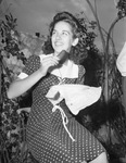 Texas Christian University Frog Band. Party. Dorothy Bryant, Sweetheart of the band smiling, holding plate and frankfurter.