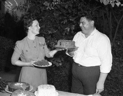 Texas Christian University Frog Band Party. Jack Weatherford, right, receiving a cake.