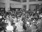 Photograph showing soldiers and civilians in the lobby of Hotel Texas Saturday night who were treated to a concert played by the Moslah Temple Shrine Band. The picture was taken while the band was playing prior to the USO dance in the Crystal Ballroom of the hotel. The band members are dressed in suits and fez hats. Published in The Fort Worth Star-Telegram Evening Edition October 28, 1941.