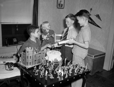 Everett Layfield (left) is celebrating his 11th birthday at his home with a group of friends. The friends, left to right, are Beatrice Jean Cope, Bobby Harris, and Billy Jones. They are shown playing with toy soldiers and presenting Everett with his birthday presents. A cake is on the table decorated with candles. Everett is the son on Mrs. Metta Layfield. He suffers from osteomyelitis, a bone disease. He is dressed in a short-sleeve shirt. Beatrice Jean is wearing a dress. Bobby is dressed in a collared shirt, necktie, and trousers. Billy is wearing a short-sleeve shirt and trousers.