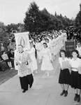 Catholics of Fort Worth in procession during a Feast Day celebration on Our Lady of Victory campus. Reverend A. Schmitt, pastor of Saint Mary's Catholic Church, leads the procession.
