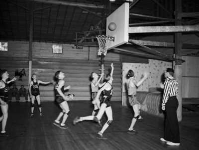 Image shows a basketball game between Denton and Burleson. Denton High School's cagers gave a neat exhibition in the district tournament at Texas Christian University Friday, beating Burleson, 39-20. Six unidentified basketball players and one referee are shown during a action shot. Published in the Fort Worth Star-Telegram morning edition, February 24, 1940.