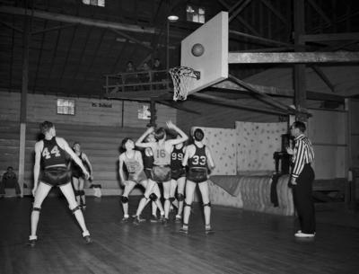 Image shows a basketball game between Denton and Burleson. Denton High School's cagers gave a neat exhibition in the district tournament at Texas Christian University Friday, beating Burleson, 39-20. Seven unidentified basketball players from left to right, (44),(15)(16), (99) (33) and one referee are shown during a action shot. Published in the Fort Worth Star-Telegram morning edition, February 24, 1940.