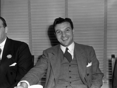 Dr. Baruch Braunstein is a guest speaker at a luncheon for the Isador Straus Lodge number 519. The luncheon is being held at the Hotel Texas, in Fort Worth, Texas. Mr. Braunstein is from New York City, New York. He lived in Central Europe during Hitler's rise to power, and witnessed antisemitic feelings. Mr. Braunstein is shown sitting on a chair, dressed in a three-piece suit.