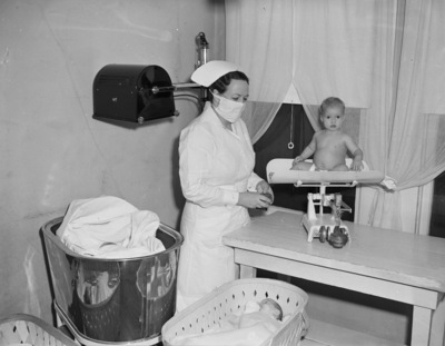 McKmay, Maude (Miss); Nurses; Infants; Hospitals; Fort Worth Children's Hospital; Scales; Uniforms; Surgical masks