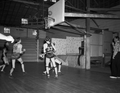 Image shows a basketball game between Denton and Burleson. Denton High School's cagers gave a neat exhibition in the district tournament at Texas Christian University Friday, beating Burleson, 39-20. Seven unidentified basketball players and one referee are shown during a action shot. Published in the Fort Worth Star-Telegram morning edition, February 24, 1940.