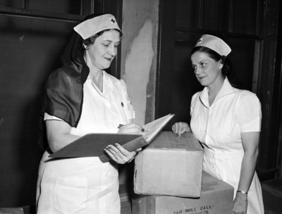 Civilian defense training for Red Cross workers. Mrs. John H. Moyar, left, and Mrs. J. R. Neil, chairman and co-chairman of the surgical dressing program, stand next to boxes, checking the shipment. The women in Fort Worth have contributed to reaching a quota order of 153,00 surgical dressings for the U.S. Armed Forces. In time of war, machinery would not be able to cope with the demand, therefore the women of Fort Worth under the Red Cross volunteer to cut and fold bandages. Published in the Fort Worth Star-Telegram morning edition, October 31, 1941.