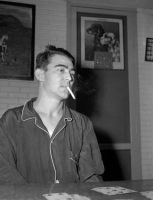 Twenty-four year old Russell M. Minard is being charged with attempted burglary. He is currently awaiting trial on the attempted burglary charge. While in police custody, Mr. Minard alleged that he was beaten by city detectives twice. The first he claimed was in 1939 when he was first arrested. The second alleged beating came during Mr. Minard's recent arrest. Police Chief Howard denied the claims, but an official investigating is being conducted. Mr. Minard is shown smoking a cigarette and playing a with a deck of cards. He is dressed in a button-up shirt.