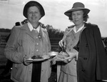 The second annual Kirven and King Ranch Field Day is being held near Waxahachie, Texas. A number of friends are in attendance to see the cattle, pastures, and barns. J. D. Kirven and J. I. King are partners in the breeding of the Herefords at their ranch. Their wives, left to right, are Mrs. J. I. King and Mrs. J. D. Kirven, the hostesses of the event. Mrs. King is wearing a hat, button-up blouse, brooch, and a coat. Mrs. Kirven is dressed in a hat, blazer, skirt, and has a coat draped over her shoulders.