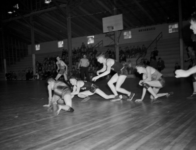 Image shows a basketball game between Denton and Burleson. Denton High School's cagers gave a neat exhibition in the district tournament at Texas Christian University Friday, beating Burleson, 39-20. Five unidentified basketball players and one referee are shown during a action shot. Published in the Fort Worth Star-Telegram morning edition, February 24, 1940.