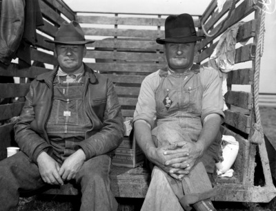 The second annual Kirven and King Ranch Field Day is being held near Waxahachie, Texas. J. D. Kirven and J. I. King are partners in the breeding of the Herefords at their ranch. A number of friends are in attendance to see the cattle, pastures, and barns. Enjoying the festivities, left to right, are Walter Banks and Joe Honz. These two men were responsible for preparing the barbecue. Mr. Banks is wearing a cowboy hat, collared shirt, overalls, and a leather jacket. Mr. Honz is dressed in a hat, collared shirt with cuffed sleeves and overalls.