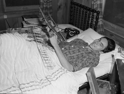 Joe McGee has been in his bed for the past seven weeks, recuperating from a spinal injury. At the end of the eighth week, he can begin sitting up in bed. While recovering, Joe has kept up with his friends by telephone, listened to world news on the radio, and built model planes. He is shown lying in bed, holding a model plane. Beside him on the bed is a telephone.