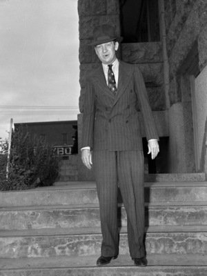 Floyd Worth Perryman is coming down the front steps as he exits a building. He is dressed in a hat and a double breasted pinstripe suit.