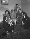 Fort Worth's rejuvenated Little Theater aims to be everyman's theater. It hopes to be a democratic meeting ground for persons of every walk of life with a mutual love for the theater. The actors and workers behind the scenes have much to do with the success of a production. The Little Theater's second production of the season will be "First Lady", sophisticated drawing room comedy laid in Washington, D.C. with Gene Crotty directing. The play-reading committee is shown huddled up as they decide the season's productions. Left to right: Mrs. Tom Perkinson seated on the floor, Mrs. Frank Mills; Miss Peggy Lewis; Walker Moore, standing ; President Bill Fonville and Director Gene Crotty, kneeling on the floor. The women are wearing long coats with dresses underneath as the men wear suits. Miss Lewis and Mrs. Mills are also wearing flat-brimmed hats. Mrs. Perkinson and Miss Lewis are holding up the play books and the group appears to be smiling. Published in the Fort Worth Star-Telegram morning edition, November 23, 1941.