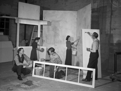 Fort Worth's rejuvenated Little Theater aims to be everyman's theater. It hopes to be a democratic meeting ground for persons of every walk of life with a mutual love for the theater. The actors and workers behind the scenes have much to do with the success of a production. The Little Theater's second production of the season will be "First Lady", sophisticated drawing room comedy laid in Washington, D.C. with Gene Crotty directing. Tommy Knight, left and his industrious young scene-builders, (left to right) Ann Barham, Dennis Kamp, Winta Beth Crawford and Wayne Stokes are working on props. The crew is shown working on various set pieces for their upcoming production. Mr. Knight and Mr. Kamp are knelt down painting a wooden prop. Miss Barham is wiping down a window piece, Miss Crawford is painting a wall and Mr. Stokes is painting a door. The women are wearing dresses and the mean are wearing trousers and dress shirts. Published in the Fort Worth Star-Telegram morning edition, November 23, 1941.