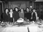Typographical Union Woman's Auxiliary representatives include (left to right) Mrs. O. I. Engleman, present chieftain, Mrs. Lenus Carlson, Mrs. Tom Prickett, Mrs. O. W. Anthony, Mrs. Stanford Steele, and Mrs. J. E. Taulman. Mrs. Anthony and Mrs. Steele are charter members. The women are standing behind a table decorated with greenery and an anniversary cake to celebrate the organization's eighteenth anniversary at Fort Worth's Virginia Lodge. The women are wearing either dresses or suits. All of them are wearing hats. This photograph was published in the November 3, 1941 evening edition of the Star-Telegram.