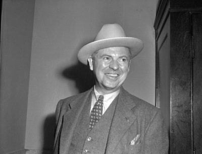 Edgar N. Gott, of San Diego, California, is the vice president and director of public relations for the Consolidated Aircraft Corporation. He is stopping in Fort Worth, Texas, to visit the Lake Worth bomber plant. While visiting, Mr. Gott received a Shady Oak cowboy hat. He is shown wearing the hat along with a three-piece suit and a pocket square.