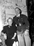 Lieutenant Colonel Hubert W. Beyette is the executive officer for the Eighth Corps Area's army depot in San Antonio, Texas. The army is establishing a similar depot in Fort Worth, Texas, where Colonel Beyette will visit and consult. In addition to military business, he is also visiting his mother, Mrs. E. A. Beyette. They are shown in the lobby of the Westbrook Hotel, where Mrs. Beyette resides. Mrs. Beyette is wearing a dark dress with a brooch. Colonel Beyette is dressed in his military uniform.