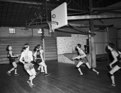 Image shows a basketball game between Denton and Burleson. Denton High School's cagers gave a neat exhibition in the district tournament at Texas Christian University, beating Burleson, 39-20. Five unidentified basketball players are shown, from right to left, (10) (66) during a action shot. The far right player is attempting to score. Published in the Fort Worth Star-Telegram morning edition, February 24, 1940.