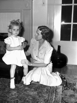 Mrs. C. B. Williams is posing with her two-year-old daughter, Charlotte. Along with Mr. Williams, the family is returning to live in Fort Worth, Texas, after spending time in Cucuta, Columbia. They made the trip to South America when Charlotte was four months old. Charlotte is enjoying pasteurized milk from a silver cup. She is wearing a bow in her hair and a dress. Mrs. Williams is dressed in a button-up blouse and a skirt.