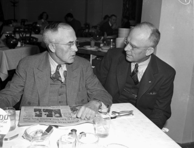 The Texas Division of the American Society of Civil Engineers is holding a two-day convention at the Hotel Texas. Awake early Friday morning for breakfast, left to right, are Harry N. Roberts and T. C. Forrest. Mr. Roberts, a society member from Lubbock, Texas, is reading the morning edition of the Fort Worth Star-Telegram. He is dressed in a three-piece, double breasted suit. Mr. Forrest, of Dallas, Texas, is wearing a dark three-piece suit.
