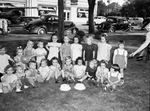 Motorists in the 400 block of South Jenning Avenue saw double Sunday during a birthday party for Lanelle and Louette Wyatt, 4-year-old twin daughters of Mr. and Mrs. W.W. Wyatt. Here are the ten sets of twins who played in the yard. Left to right, and with the first named in each set sitting, the other standing in rear, they are: Mary Jane and Dorothy Rylander, Judy and Jan Carter, Robert and Robin Watkins, Don and Billie Shaw, Lanelle and Lounette Wyatt, Robert and Ronald Brady, Margaret and Marilyn Harkins, Peggy and Jean Nunns, Janette and Janice Bettis and Sandra Joyce and Wanda Loyce McCormick. The twins are divided into two rows, with each row either standing or sitting on the lawn. There is a birthday cake directly in front of Lanelle, and another cake in front of Margaret. Judy and Jan hold balloons. Published in Fort Worth Star-Telegram October 28, 1941.