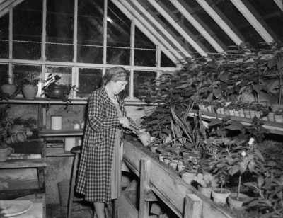 Mrs. Jack Knight in greenhouse. Mrs. Knight, a dirt gardener, whose garden will be open to visitors on first Thursdays throughout the year. The open house is a special educational project of the horticulture committee of the Fort Worth Garden Club.