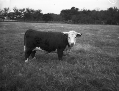 Dorana 25th, perfect example of a Hereford cow on Jinkins Hereford Ranch. She was sired by Prince D. Mischief, the bull for which Northwood Farms at Fort Worth paid $2,250 to Harrisdale Farms of the same city.