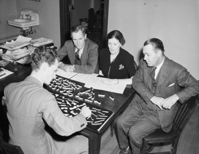 The Fort Worth-Tarrant County Tuberculosis Society is examining a former patient, who is cured and ready for vocational training. Through a scientific test board, they are measuring his skills and aptitudes. Left to right are C. G. Fairchild, Miss Sula Fleeman, and W. Beverly West Junior. Mr. Fairchild is the district supervisor of the vocational rehabilitation for the State Department of Education. He is dressed in a three piece suit. Miss Fleeman is the executive secretary of the Society. She is wearing a button-up blouse and a pearl necklace. Mr. West is chairman of the society's rehabilitation committee. He is dressed in a three piece suit wit ha pocket square.