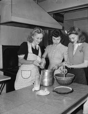 Young Women's Christian Association. Girls cooking, left to right, Misses Elizabeth Ann Cotner, Juanita Farmer and Jane Wand. Fort Worth Star-Telegram Morning Edition. 1941-11-04. Photograph of three young ladies in a kitchen, preparing food. They are standing around a table, working as a team on preparing a pie.