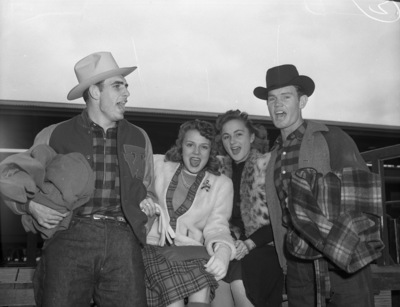 The Texas Wesleyan College football team is hitting the road to play Howard Payne University in Brownwood, Texas. Some of the Ram fans are following the team to support them on the road. Traveling with the team, left to right, are Weyman Cotton, Miss Billy Pittard, Miss Doris Gathins, and Hardy Fortenberry. The mixed quartet is getting together to try out their vocal chords. Cotton, of Iola, Texas, is a member of the Rams' basketball team. He is dressed in a cowboy hat, plaid shirt, letterman jacket, and jeans and carrying a jacket. Miss Pittard, is from Anson, Texas. She is wearing a blouse, blazer, and a plaid skirt, pearl necklace, broach of a drummer, wearing a large ring and carrying gloves. Miss Gathins, of Fort Worth, Texas, is wearing a dress and a fur vest and a wrist watch and bracelet. Fortenberry, of Greenville, Texas, is also on the Rams' basketball team. He is dressed in a cowboy hat, plaid shirt, letterman jacket, and jeans and carrying a jacket. Cotton, six-foot-seven-inches and Fortenberry, six-foot-four-inches, tower above their classmates. Published Star-Telegram Morn. Nov. 1, 1941.