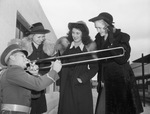 The Texas Wesleyan College football team is hitting the road to play Howard Payne University in Brownwood, Texas. Some of the Ram fans are following the team on the T. W. C. special train. Rehearsing on the railway platform before the train pulls out is Graham Bevel. Watching the bandsman, left to right, are Miss Nan Cashion, Miss Elaine Daniels, and Miss Dorothy Jo Garlington. Mr. Bevel is a member of the college band. He is playing his trombone and dressed in a band uniform. Miss Cashion, of Fort Worth, Texas, is wearing a hat and a coat with mink fur around the collar. Miss Daniels, also of Fort Worth, is dressed in a hat, collared blouse, and a coat with a fox fur collar. Miss Garlington, of Electra, Texas, is dressed in a felt hat, a Persian lamb coat hat, necklace, and gloves. Published Star-Telegram Morn. Nov. 1, 1941.