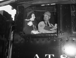 The Texas Wesleyan College football team is hitting the road to play Howard Payne University in Brownwood, Texas. Some of the Ram fans are following the team on the T. W. C. special train. While engineer C. G. Woods was outside oiling the locomotive, Miss Jeanette King mounted the cab. Fireman L. A. Tutt is lending an approving smile as she is about to pull the throttle for the non-stop run to Brownwood. Miss King is a freshman at T. W. C. She is wearing a mum and is dressed in a hat, coat, and a scarf. Mr. Tutt is wearing a conductor's hat, collared shirt, necktie, and overalls. The letters for Atcheson, Topeka, and Santa Fe (A.T. &) show below the pair. Published Star-Telegram Morn. Nov. 1, 1941.