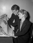 A Naval ship, the USS Reuben James, was hit by a torpedo near Iceland on October 31, 1941. Announcement of the sinking ship was broadcast over the radio. Families of the crew - seven officers and 136 enlisted men - are awaiting news. Reading a front page story in the Fort Worth Star-Telegram are Mrs. Dorothy Dodd and her son, Alvin Dodd, They are waiting to hear the fate of Mrs. Dodd's brother, Charles Cox, a crewman on the Reuben James. Alvin is dressed in a pinstripe suit. Mrs. Dodd is wearing a blouse, necklace, blazer, and a skirt.