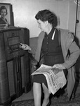 A Naval ship, the USS Reuben James, was hit by a torpedo near Iceland on October 31, 1941. Announcement of the sinking ship was broadcast over the radio. Families of the crew - seven officers and 136 enlisted men - are awaiting news. Mrs. Nancy Reid is shown tuning her radio and reading the front page story in the Fort Worth Star-Telegram. Her son, Lee Reid, is a crewman on the Reuben James. Mrs. Reid is wearing a button-up blouse, skirt, and a coat.