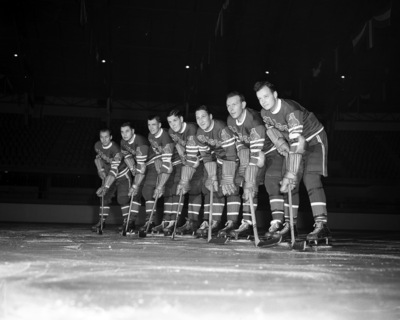 Seven players of the Fort Worth Rangers ice hockey team; from left, Pete Leswick, Pete Pleban, Bert Connolly, Gene Carrigan, Bert Peer, Ross Knowles, and Lloyd Jackson, 11/01/1941