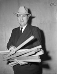 Police Captain Ed. K. Lee, wearing street clothes, is holding an armload of the birch and maple nightsticks. The sticks resemble shillelagh and are one and one-fourth inches in diameter and 24 inches long. The city's budget did not furnish the sticks and had to be funded by the officers. Patrolman Tom Brown turned down the sticks from raw lumber. Captain Lee distributed the sticks to members of his platoon. Beat patrolmen were ordered this week to start carrying the nightsticks again after six years without them. Published in the Fort Worth Star-Telegram morning edition, November 2, 1941.