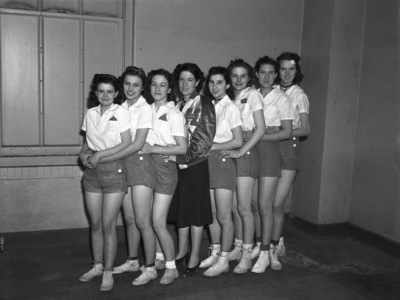 Haslet Girls' Basketball Team Champions of Tarrant County, Class B members (left to right) Joyce Kilpatrick, Dorothy Skinner, Leota Jackson, Hazel Bumgarner, Doris Shelton, Dorothy Bledsoe, Wilma Crawford and Mary Halbert. The pretty lassies above compiled 230 points for Haslet High and were undefeated this season.