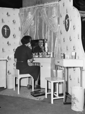 Christmas gift suggestions. If there is any doubt about what to get her for Christmas, here are some helpful hints. June Blevins demonstrates at this tidy vanity with its imported French, hand-cut mirror, with matching cream and powder jar set and tissue holders. Blevins is sitting at the vanity, looking in the mirror and rubbin her face with a tissue. Published in the Fort Worth Star-Telegram Evening Edition November 20 1941.