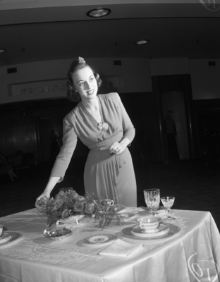 Christmas gift suggestions. Jean Stevenson demonstrates how well the lady of the house can look in a deep rose-colored dinner dress. She's seen to be setting the table for the Christmas dinner. Published in the Fort Worth Star-Telegram Evening Edition November 20 1941.