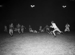 A Texas Conference football game is being held Friday night in Brownwood, Texas. The Howard Payne Yellow Jackets are hosting the visiting Texas Wesleyan Rams. Yellow Jacket quarterback Tommy Samuels is shown running the ball in the second quarter of the game. He is sweeping over the left end for a five-yard gain. He was tackled on the thirty-one yard line by defenders Ruel Hoffman (25), Marcell Harrison (38) and Kave King (43). Samuels figured into all of his team's touchdowns as the Yellow Jackets beat the Rams 20-7. Published Star-Telegram Morn. Nov. 2, 1941.